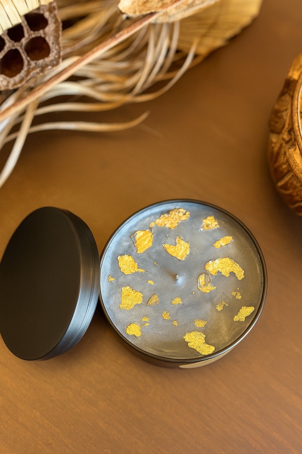 Elevate your atmosphere with our hand-poured artisan candle, presented in a modern matte-black metal container (8 cm wide, 6.1 cm high). Crafted with 130g of premium natural soy wax, this candle is enriched with a deep grey dye that creates a smooth, elegant finish.