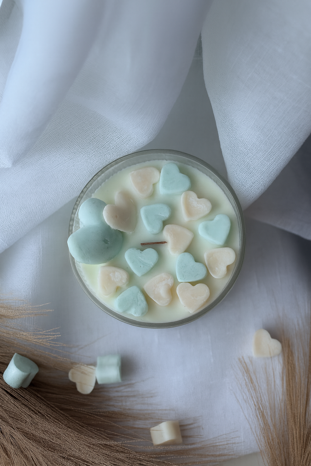 wooden wick slightly before each lighting to enjoy an even, long-lasting glow. Topping it all off are pastel blue and soft peach heart-shaped wax embeds, lovingly placed for a unique decorative touch.