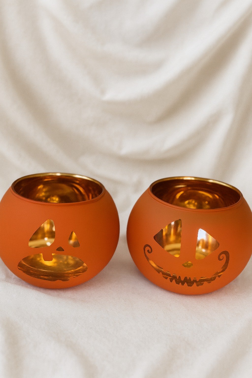Crafted with a matte orange exterior, the holders showcase cut-out pumpkin faces that let the candlelight shine through, enhancing the flickering effect. The metallic amber interior adds a rich, warm reflection that complements the pumpkin design and elevates the holiday mood.