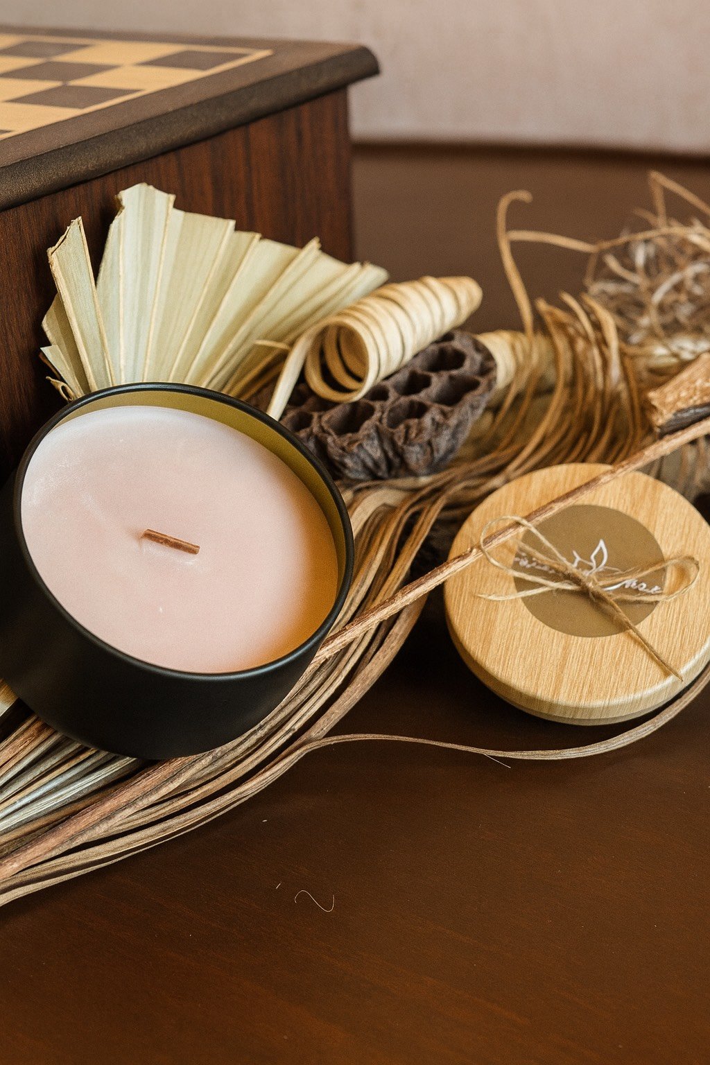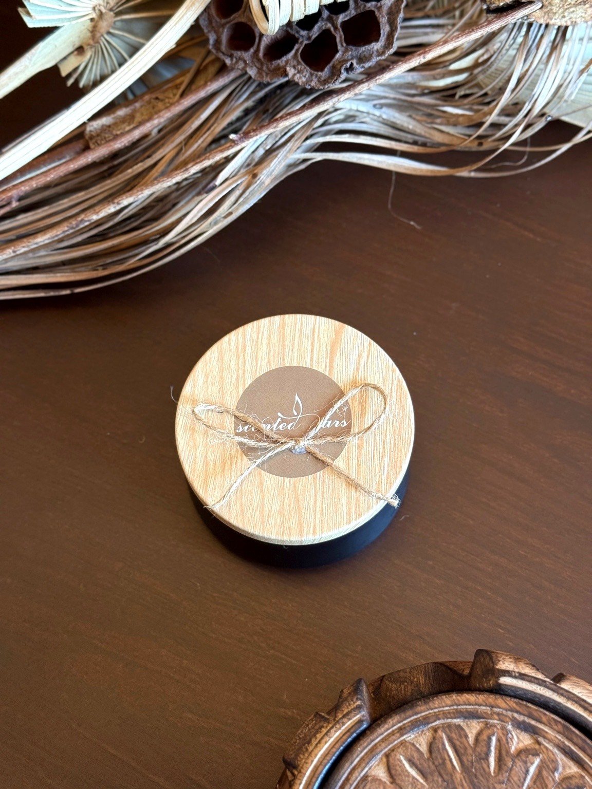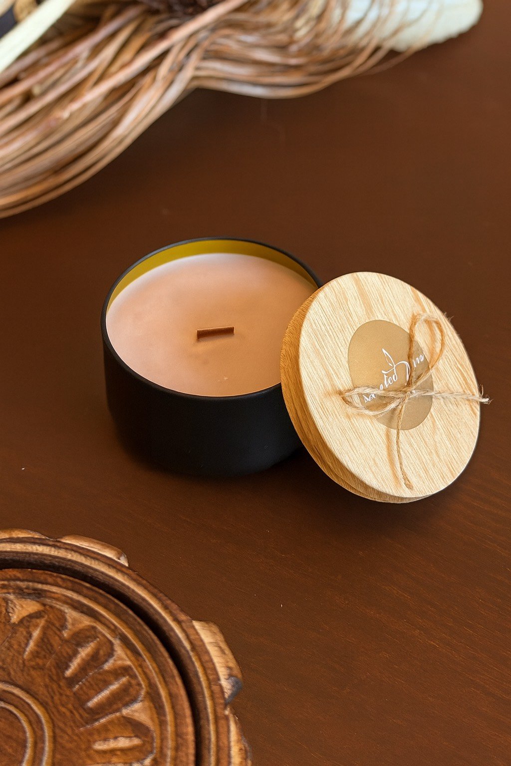 Infuse your space with cozy charm through our hand-poured artisan candle, housed in a refined matte black container (8.8 cm wide, 5.6 cm high). Its light brown wax creates a warm, earthy aesthetic that pairs beautifully with the minimalist design, offering both elegance and comfort in one piece.