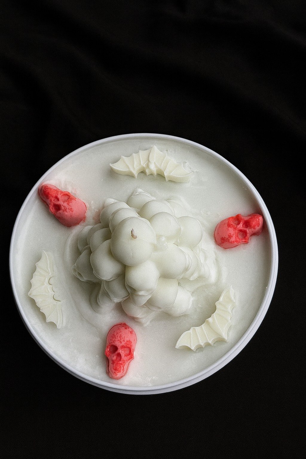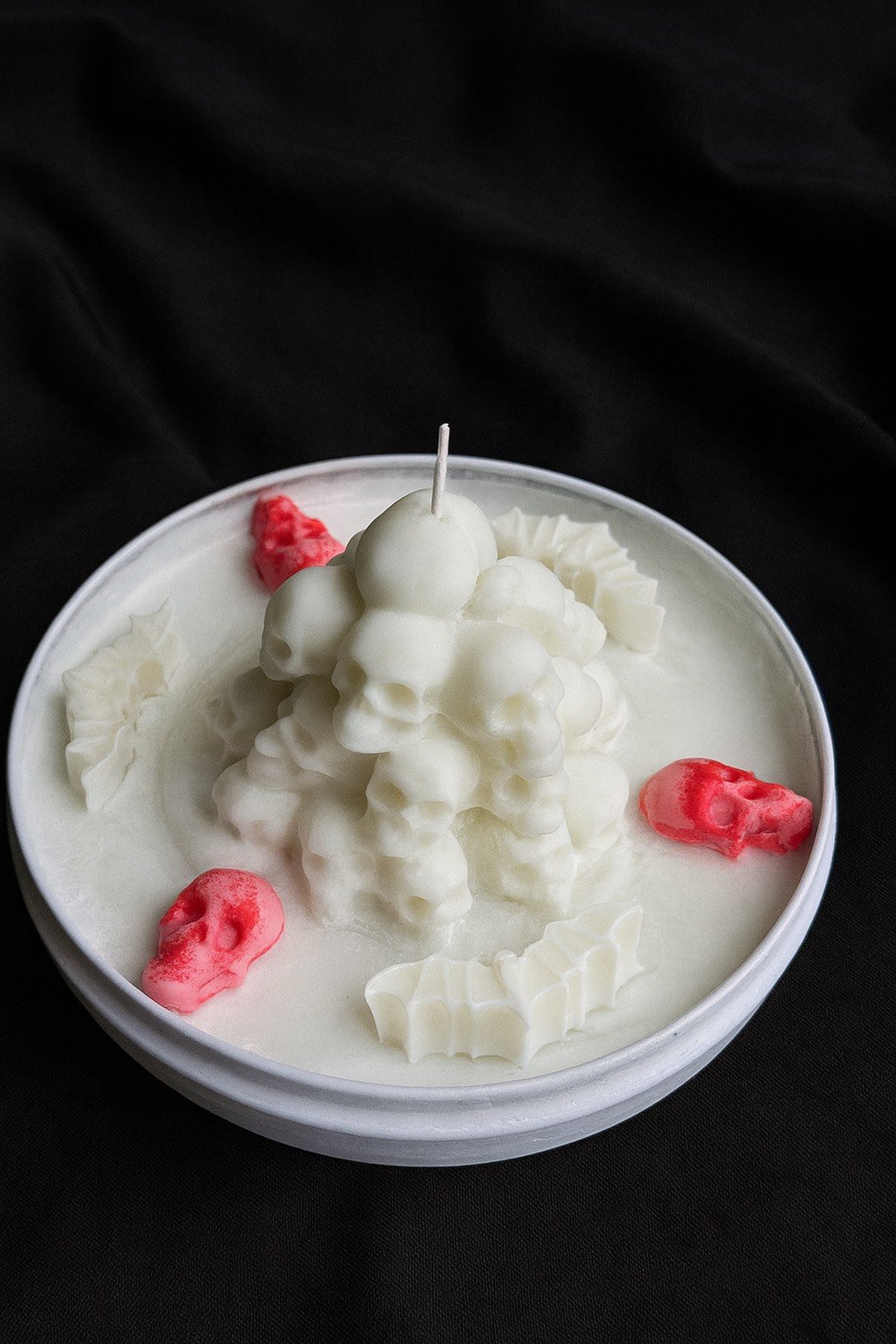 Around the skull peak, crimson red skulls and delicate white bat wings are embedded into the smooth wax surface, creating a chilling yet playful scene that feels straight out of a haunted crypt.